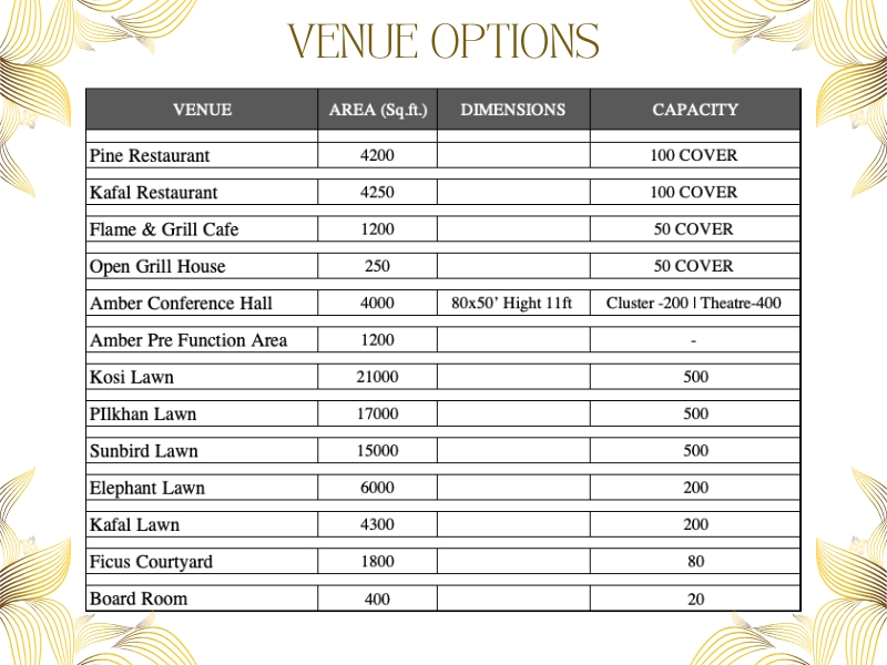 Whether you are planning a business conference, team bonding events or corporate outings, we have multiple venues for you equipped with elegant setup, Audio video arrangements and all the necessary components to ensure your event is a succes